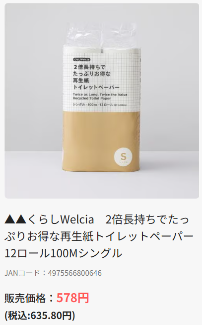 トイレットペーパーは2倍巻で12ロール635円なので、1倍巻1パックあたりで考えると317.5円ですから、まぁ高くはないかなという程度ですが、ウエルシアの日なら423ポイント!今時1パック211.5円じゃ買えませんよ!