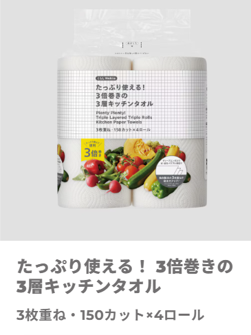 ティッシュとキッチンタオルもこれらが一番コスパが良かったのでリピ買い中です。