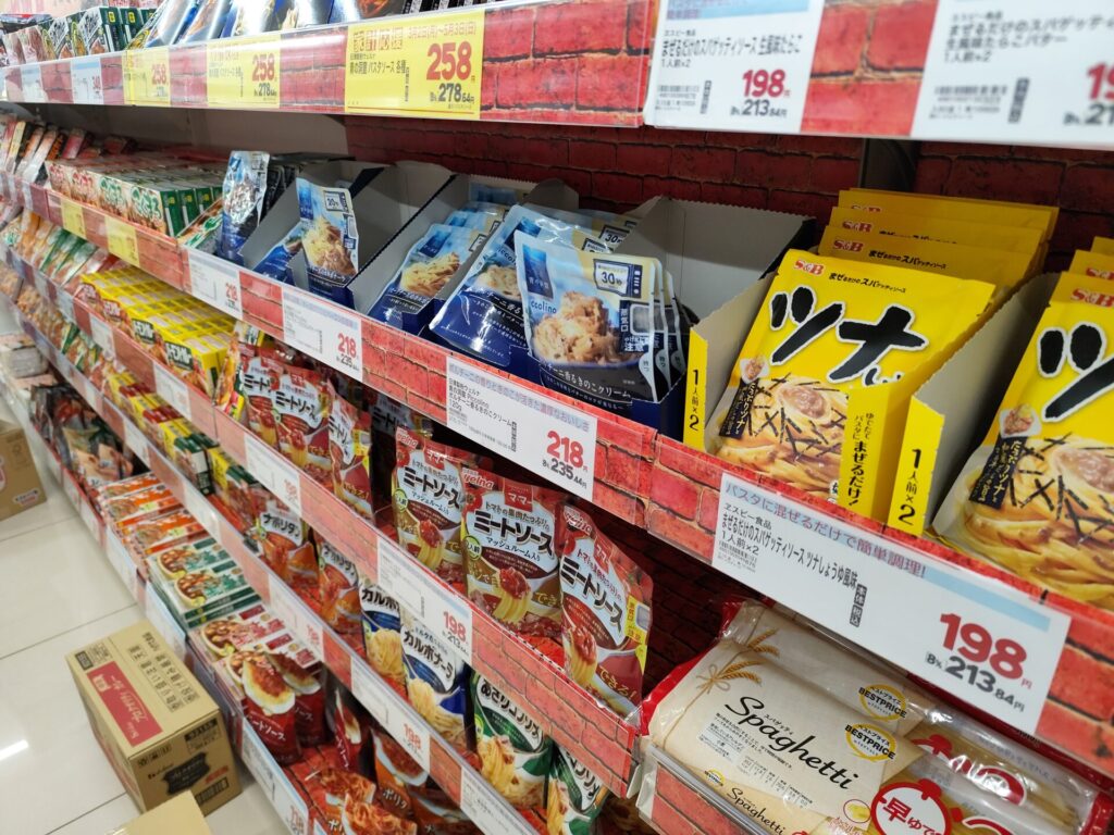 パスタソースやカレー等のレトルト食品も(店によりますが)種類が多く安いと思います。