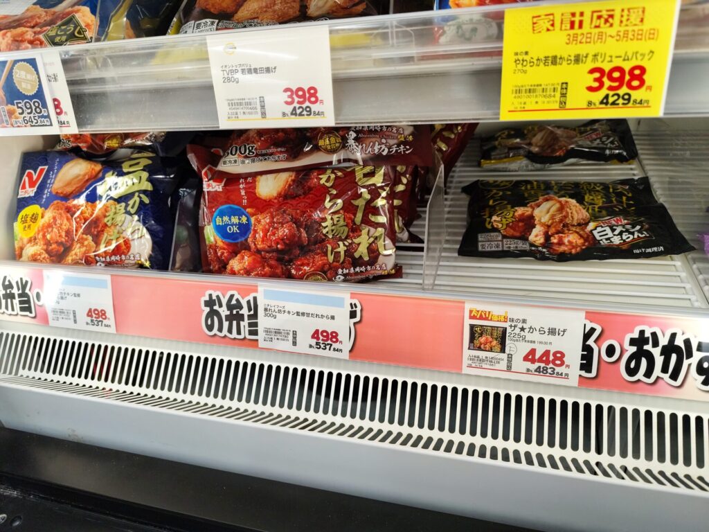 冷凍餃子は、スーパーだと底値が税抜188円、通常208~228円くらいな事が多いので、常に税抜198円の餃子を置いてくれてるウエルシアで買うのが一番お得です。