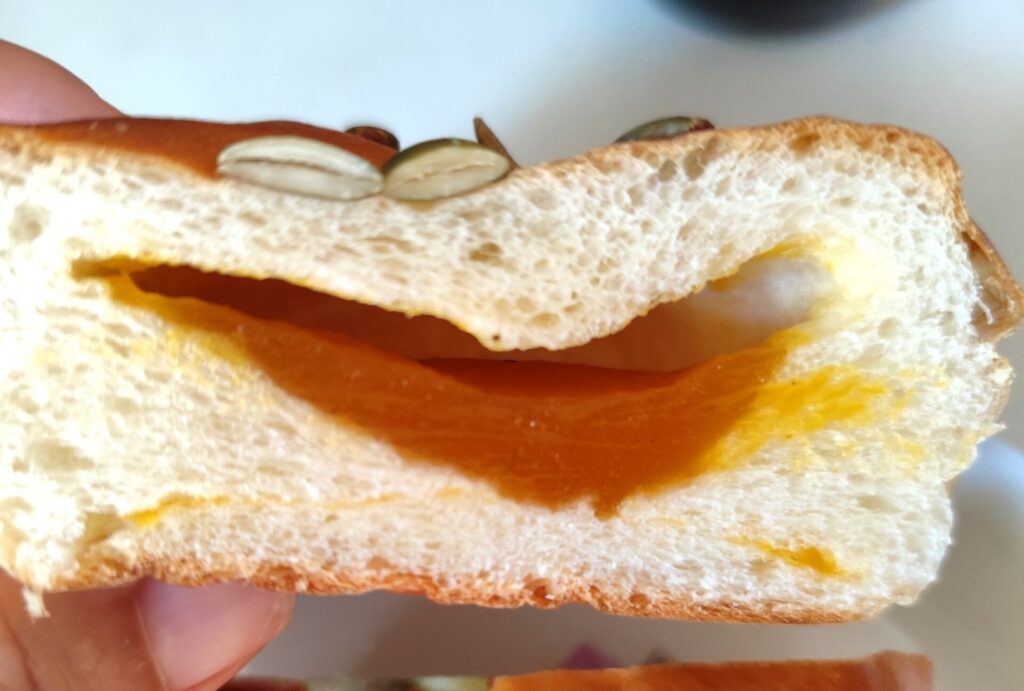 かぼちゃに砂糖やバターを混ぜてつぶしたフィリングかと思ったけど、完全にカスタードクリーム!かぼちゃ風味って感じでトロトロのクリームが新感覚です♪