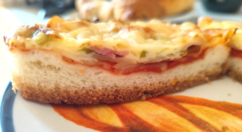 ピーマンや玉ねぎ等の野菜もたっぷりで、トマトソースとチーズがそれらを包み込んで満足感があります。