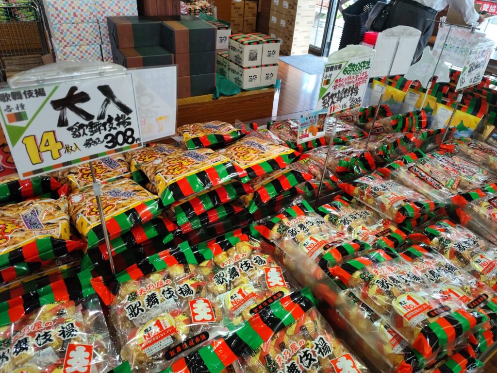 お店の中はどこを見ても、おなじみ歌舞伎揚げのパッケージの赤と黒と緑がいっぱい!