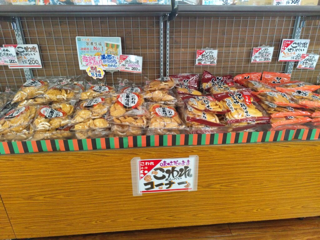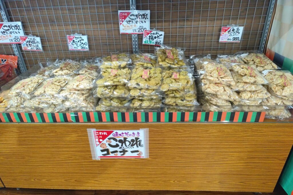 工場直売のこわれせんべいだけでなく、通常の個包装の商品やミニタイプ、歌舞伎揚げ以外のかりんとうなどのお菓子、進物用の箱入りと、とにかくたくさんのおせんべいが所狭しと並んでいます。