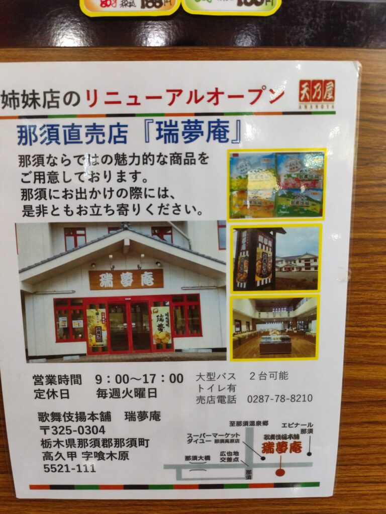▼そして、那須にも『瑞夢庵』という姉妹店もあるそうです。那須には何度か旅行で行っていますが全然知りませんでした。東京と同じようにお得なこわれせんべいもたくさんあるようです!