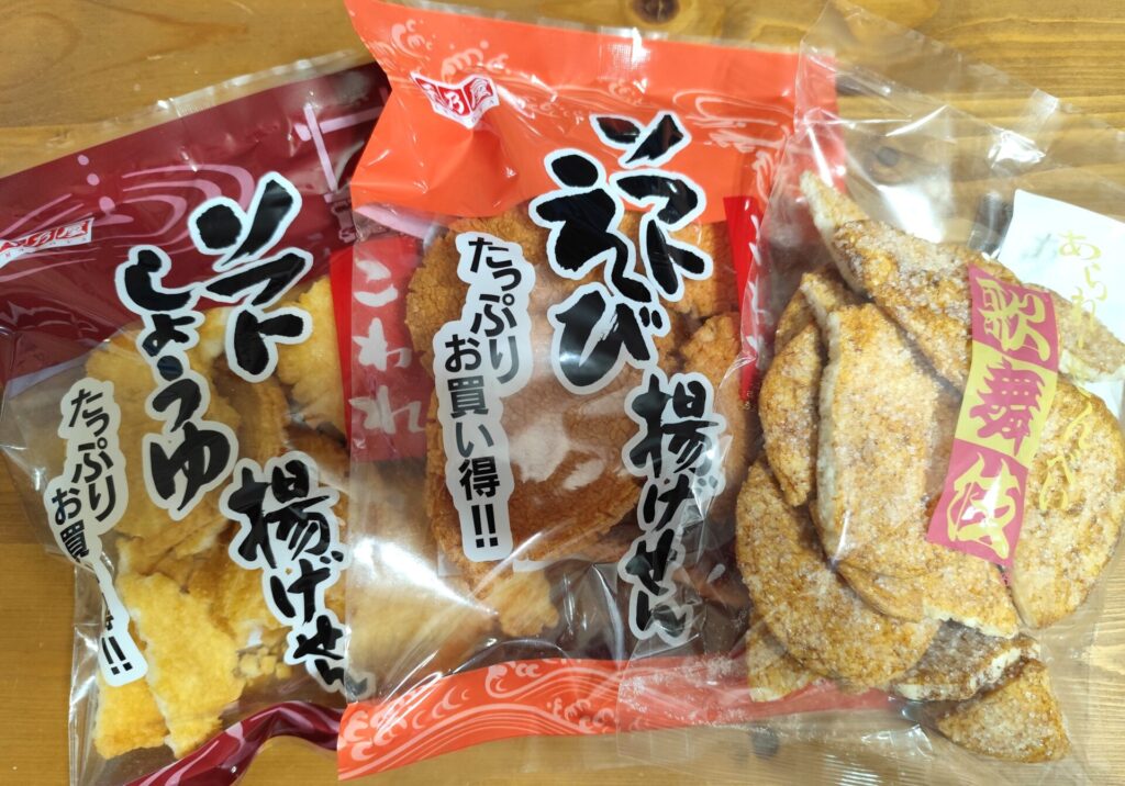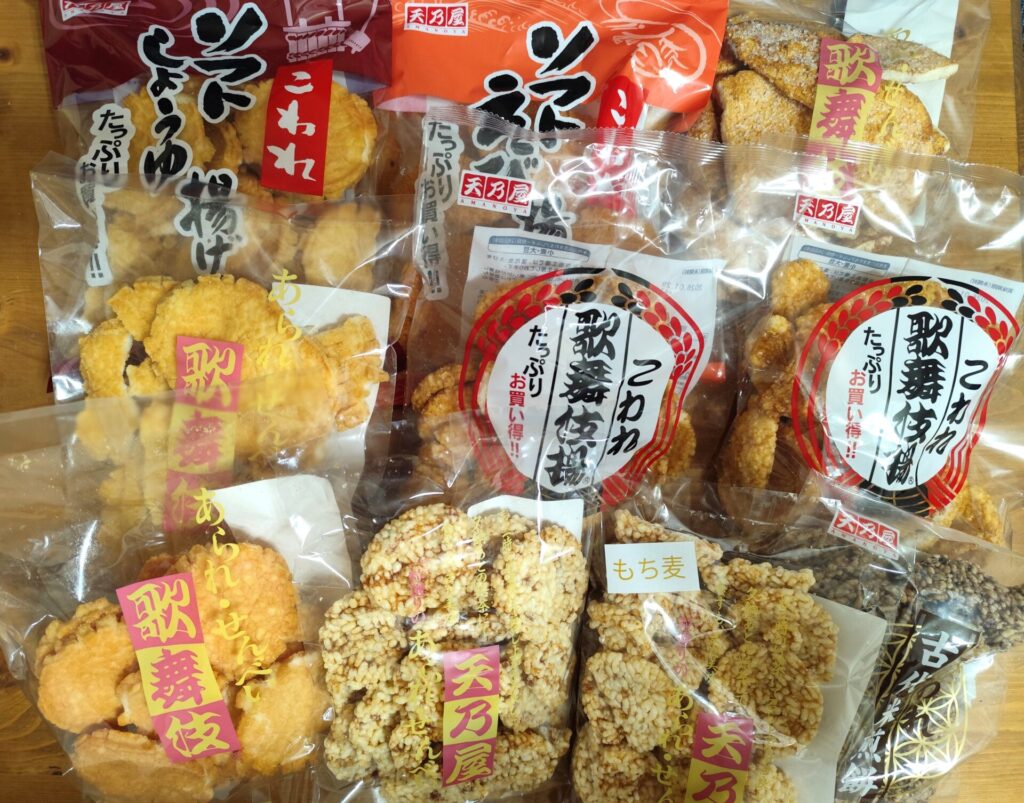 小粒の歌舞伎揚げ、大きい歌舞伎揚げ、個包装、箱入り等いろんな歌舞伎揚げがあります。