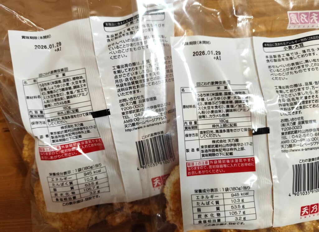 180gも入って200円なので、税抜にすると約185円。おせんべいって1g2~3円はするイメージなので、ちょっとビックリする安さです。