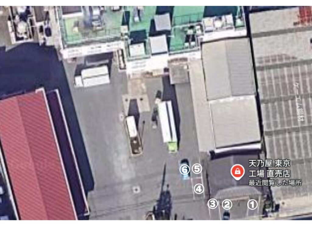 『天乃屋 東京工場直売店』の駐車場は、お店の前に3台と、横に数台停める事が出来ます。