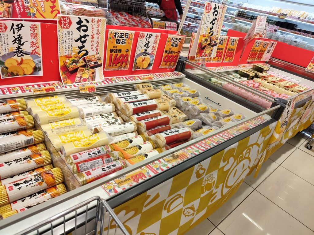 ・・・が、結構売り場がばらけていてちょっと見づらかったです(東村〇店)。上の画像は伊達巻とかまぼこのコーナーですが、遠く離れたお魚コーナーにもかまぼこと伊達巻があったし・・・。数の子も離れてるし・・・。