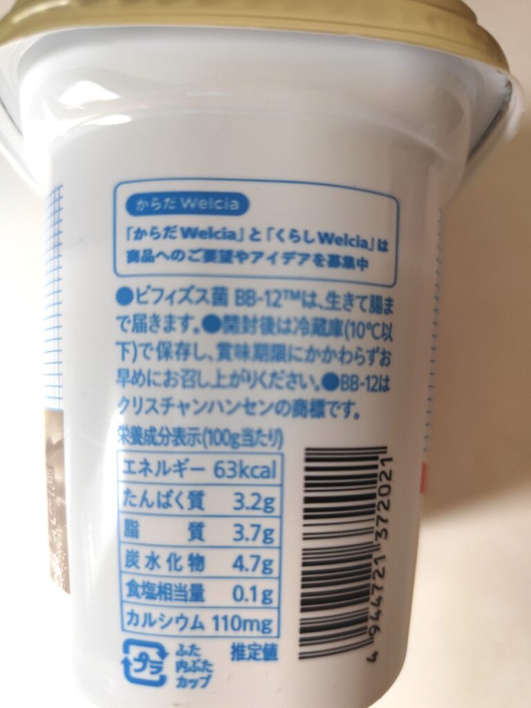 名前がわかりやすい事に定評がある『からだWelcia』の商品ですが、こちらもビフィズス菌BB-12の特徴である『生きて腸まで届く』と入ってます。腸活してる~!って感じがします(笑)。