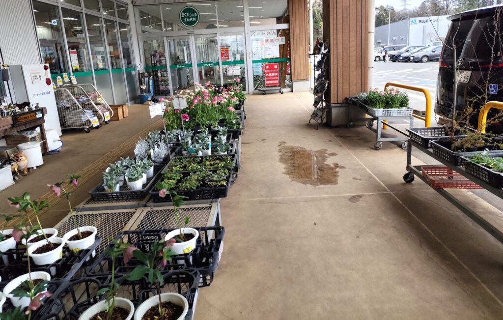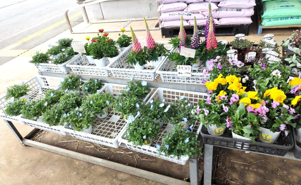 お店の入口前にはたくさんの花の苗や土、肥料などがあります。