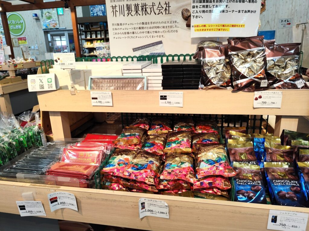 実はここ『あぐれっしゅげんき村』には、今行ってきたばかりの芥川製菓のチョコレートもおいてあります。