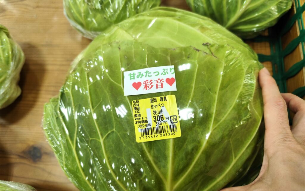 ▼あまりにも大きくてつい写真に取ってしまったキャベツ。大きいのも小さいのもあって、大きさによって値段も変わるので「どれが大きいかな?」と悩まずに済みます。