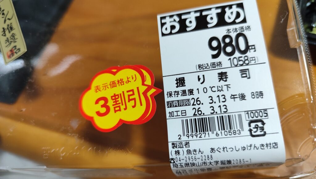 | 3割引き握り寿司 | 1058円→740円 |
