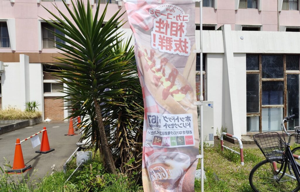 埼玉県の三芳町にあるパンの工場直売所のエーキドーパンに久し振りに訪れましたら・・・駐車場に気になる幟を発見!!