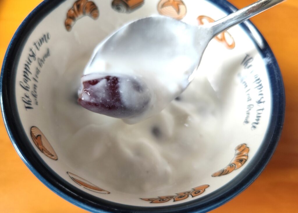全解凍してあまり美味しくなくなったぶどうは、ロピアの生乳100%プレーンヨーグルトに混ぜて食べたら甘さがちょうど中和されました。